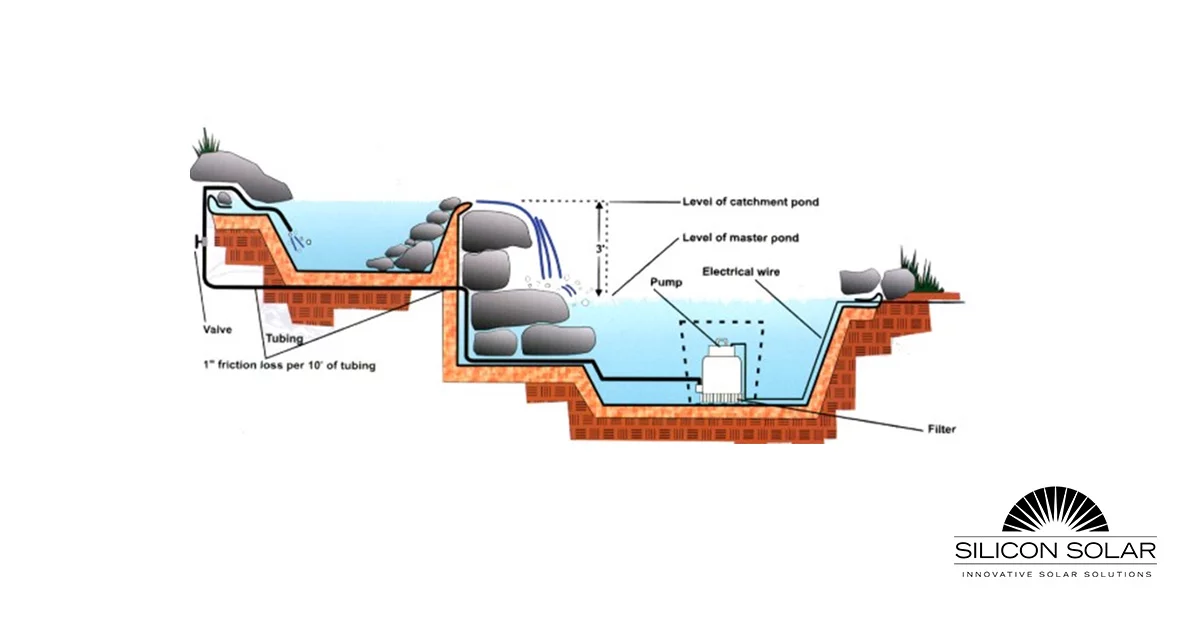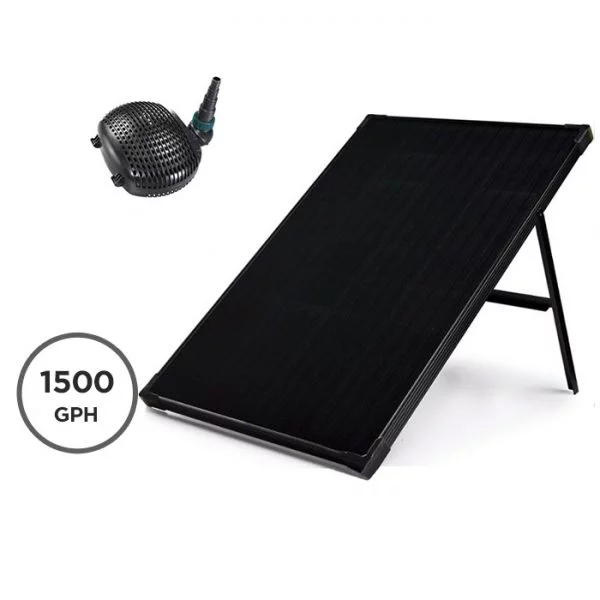 1. The solar panel directly powers the submerged solar waterfall pump kit (we also have battery storage options if you are interested in providing power to your solar pump kit when the sun goes down). For more information please call our sales team as the system design will be according to your climate and desired operating time.